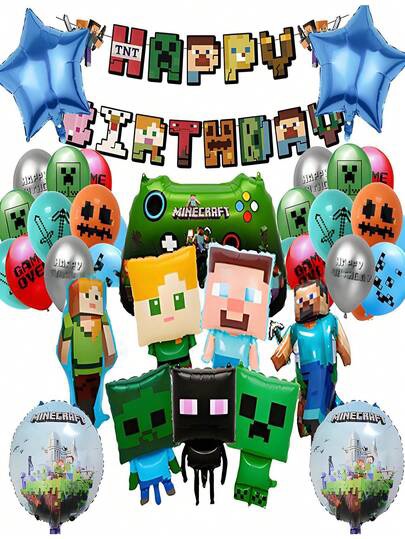 🛒マインクラフト ビデオゲーム ピクセル グリーン 草ブロック、スティーブ、アレックステーマ 誕生日 デコレーションセット、24個のラテックス風船、12個のフォイル風船、1枚のバナーを含む、誕生日パーティーの装飾に最適、ハロウィン、クリスマス、誕生日にも使えます